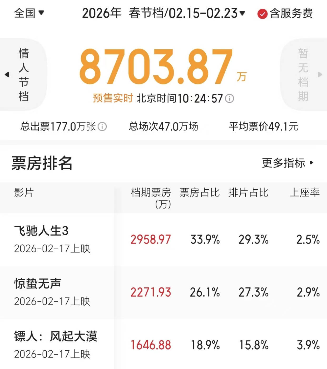 六部新片中,《奔驰东谈主生3》的预售票房收货位居第一。不仅如斯,它的平台念念看东谈主数相通也遥遥最初。由此可见,本年春节档的冠军基本仍是莫得争议了。