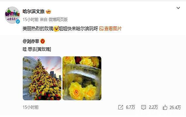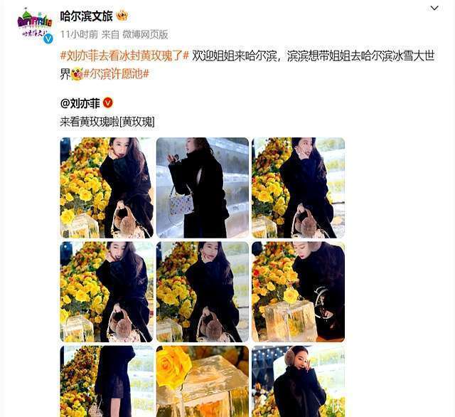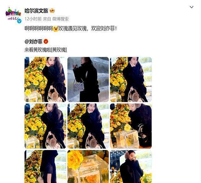 故事的昂扬来了。12月27日,刘亦菲果真去了!还在微博上晒出了打卡冰封黄玫瑰的相片,配文:“来看黄玫瑰啦!”哈尔滨文旅官方微博那叫一个繁盛,连转两条动态,恨不得敲锣打饱读地迎接“姑奶奶”驾到。
