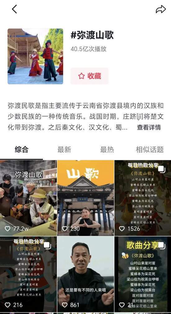 源自云南省大理州弥渡县的 国度级非物资文化遗产《弥渡村歌》, 凭借创意改编、明星助推与全民二创, 达成时局级传播。 末端3月16日, 仅抖音#弥渡村歌 话题 播放量达40.5亿次, 17.4万东谈主次参与创作。 从原土非遗走向国际舞台, 从田间小调到全网“顶流”, 这首歌到底有何迷东谈主之处? 乡愁为引 自信作帆 2025年,在澳大利亚新南威尔士州中国粹生学者联谊会举办的国庆中秋晚会上,几名中国留学生身着少数民族衣饰,跟着《弥渡村歌》轻歌曼舞,完成了一次精彩的舞台呈现。 这段上演视频上线后速即