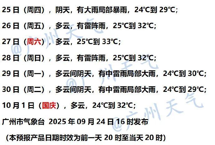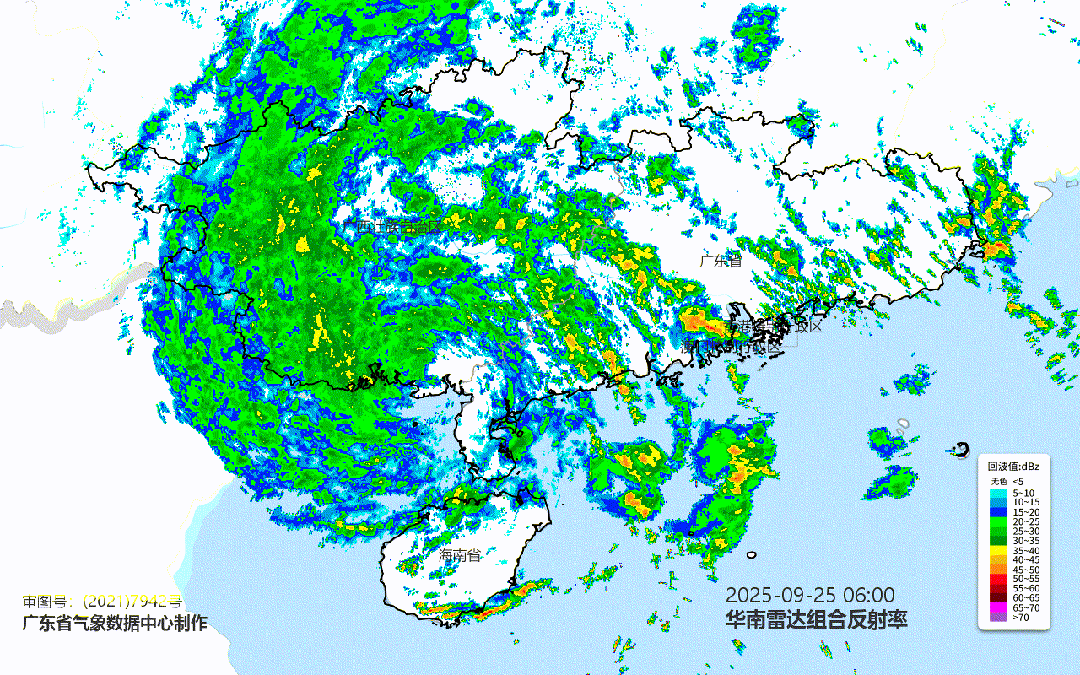 9月25日,粤西市县大到暴雨转中到大雨,珠三角、粤东市县大雨转阵雨,其余市县有阵雨局部大雨。最高气温:广东大部27℃~30℃。