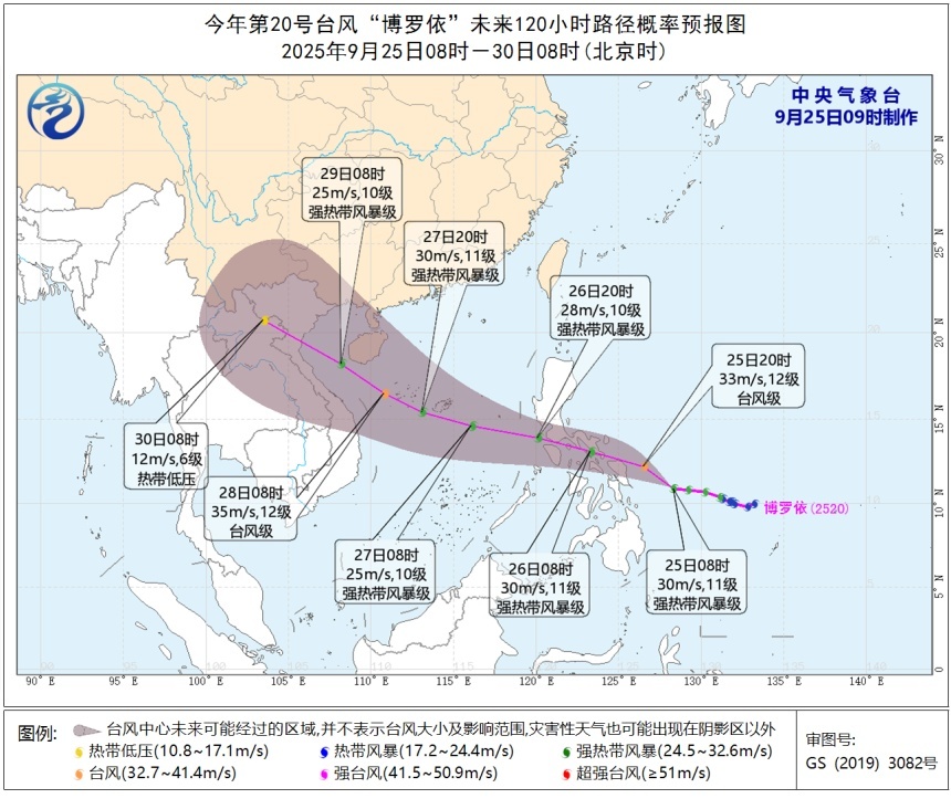24日5时,本年第20号台风“博罗依”在菲律宾以东瀛面生成。24日17时,“博罗依”中心位于距离菲律宾马尼拉东偏南边向约1270公里的洋面上,中心近邻最大风力为8级(20米/秒)。展望其将向西朔方针移动,9月26日前后穿过菲律宾吕宋岛干与南海东部海面,强度逐步加强到台风级,9月28日—29日趋向海南岛东部海面。