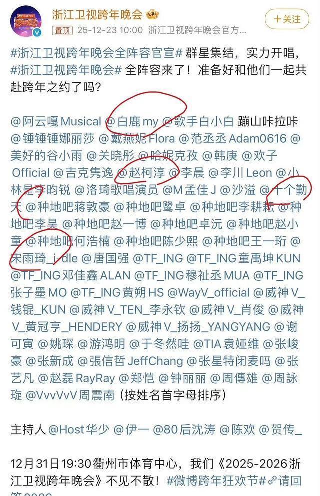 浙江卫视:中规中矩,靠综艺熟东谈主撑场 比较之下,浙江卫视能打的牌如实未几,此次官宣的跨年威望还被不少网友吐槽“最拉胯”。 定睛一看,威望里大多是“叫不出名字”的艺东谈主,能让东谈主记着的,基本都是浙江卫视自家综艺的熟样貌。