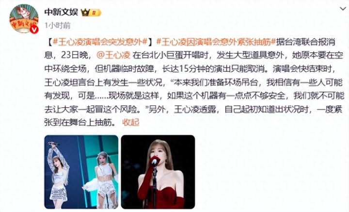 据媒体报说念,1月23日晚,王心凌在台北小巨蛋开唱时,发生大型说念具偶而,她正本要搭上“SUGAR HIGH纵容版黑甜乡飞天糖罐子”在空中环绕全场,但机器临时故障,长达15分钟的献艺只可取消。