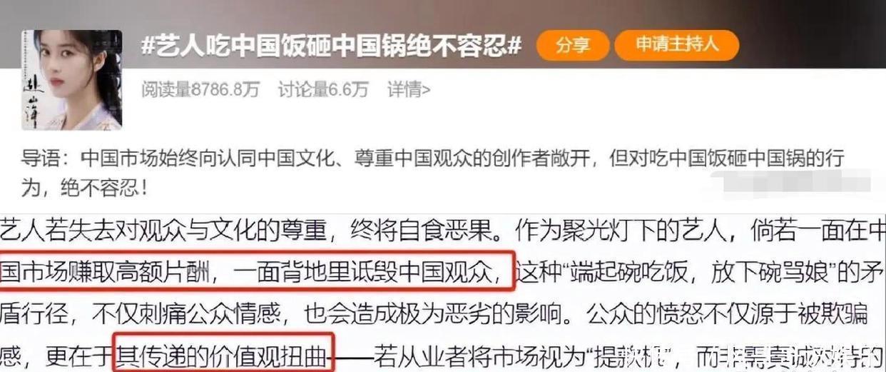 此时的她依旧莫得签订到事情的严重性,不论不问。然后媒体介入了,杰出50家官媒下场发声。其中北京日报发文称,“此活动影响极其恶劣,传递的价值不雅诬蔑。一面在中国商场赚取高额片酬,一面乱骂中国,悉数不行容忍。艺东谈主失去了对不雅众,对文化的尊重,终将会自食效果”。
