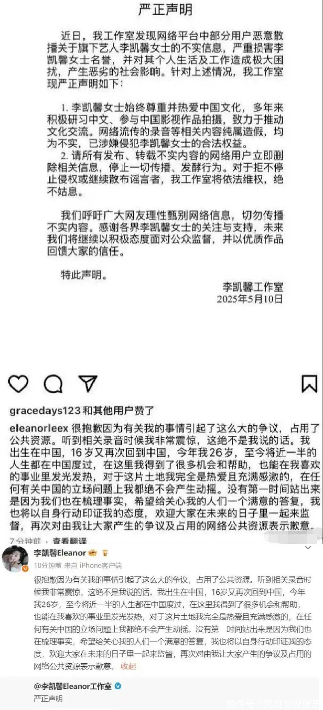 说是谈歉,其实也不是确凿的谈歉。先是她的使命室在5月10日发了声明,说是网上对于流传她的灌音是假的,齐是流言。随后她我方也在评述区进行回话,抓有的不雅点亦然灌音齐是假的,对于灌音中的实质她感到很吃惊,这些话并不是我方说的。我方在中国待了十几年,从来莫得过态度问题。