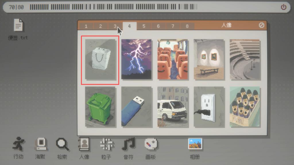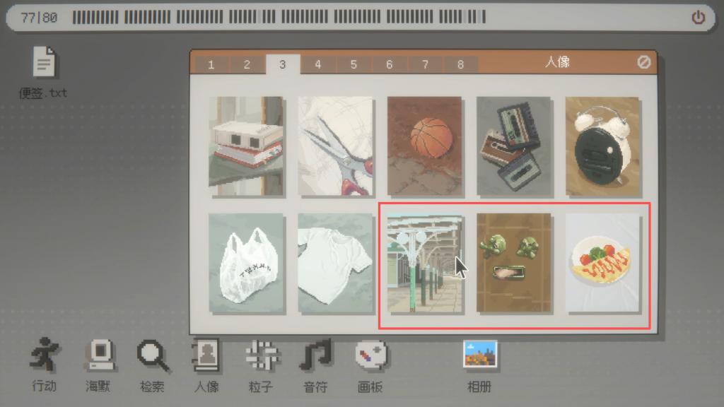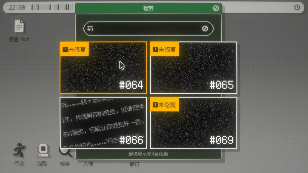 在舆图中探索时,玩家可以鸠集到一些长得很像东说念主脸的物品的图像,每个图像都与一段发生在这里的追念相关。玩家可以通过阅读这些故事,自行寻找要津词,再通过与海默对话、以及在海默的系统中检索它与在这里生活过的变装们的对话记载,缓缓将碎屑化的信息凑合起来,鼓吹游戏。