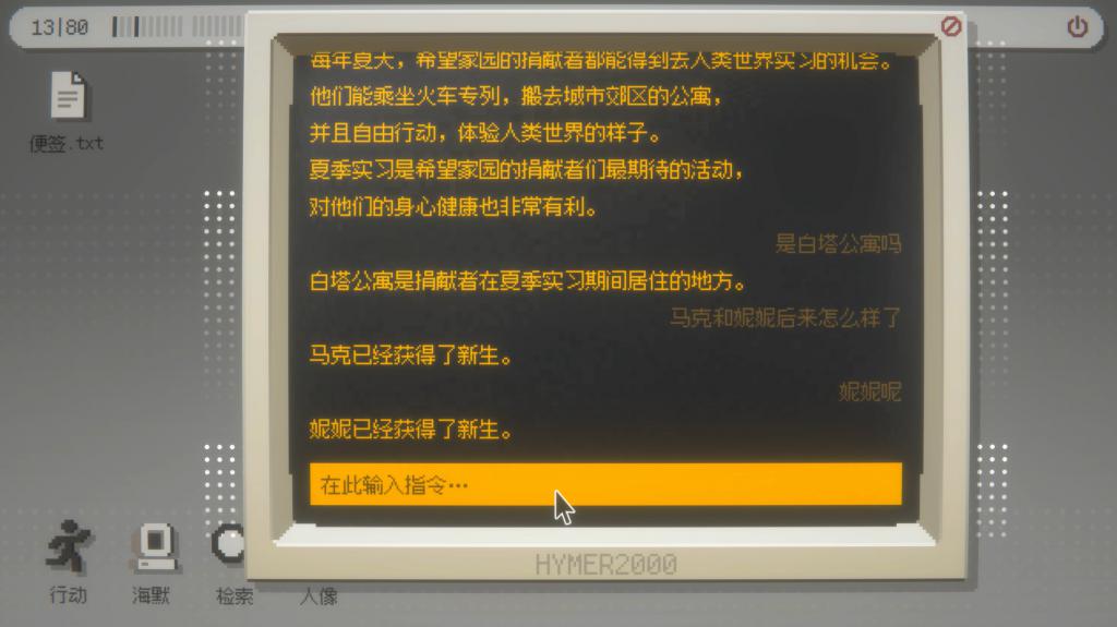 A:我认为《海默 2000》的玩法是围绕两个文本框张开的,一个是和海默聊天的文本框,一个是检索的文本框。是以这个游戏的特色等于可以开脱输入,但是这两个文本框都有一个特色:不是输入什么都能得到隔绝的,如果问题无关的话海默是不会正确回答的。
