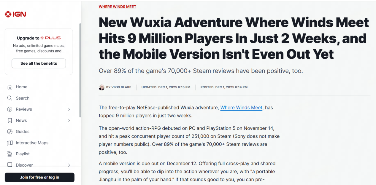 而当3A级品性向移动端移动,中国风越刮越苍劲。横跨泰西、日韩、东南亚、中东等50多个国度的数百家外媒报谈《燕云十六声》移动端环球上线的音信,并展望移动端上线后用户数将会激增。值得正经的是,此前赐与“6分”评分的IGN都景仰游戏在尚未发布移动端的情况下,照旧招引了900万玩家,且Steam上有7万多用户给出了89%的好评率。