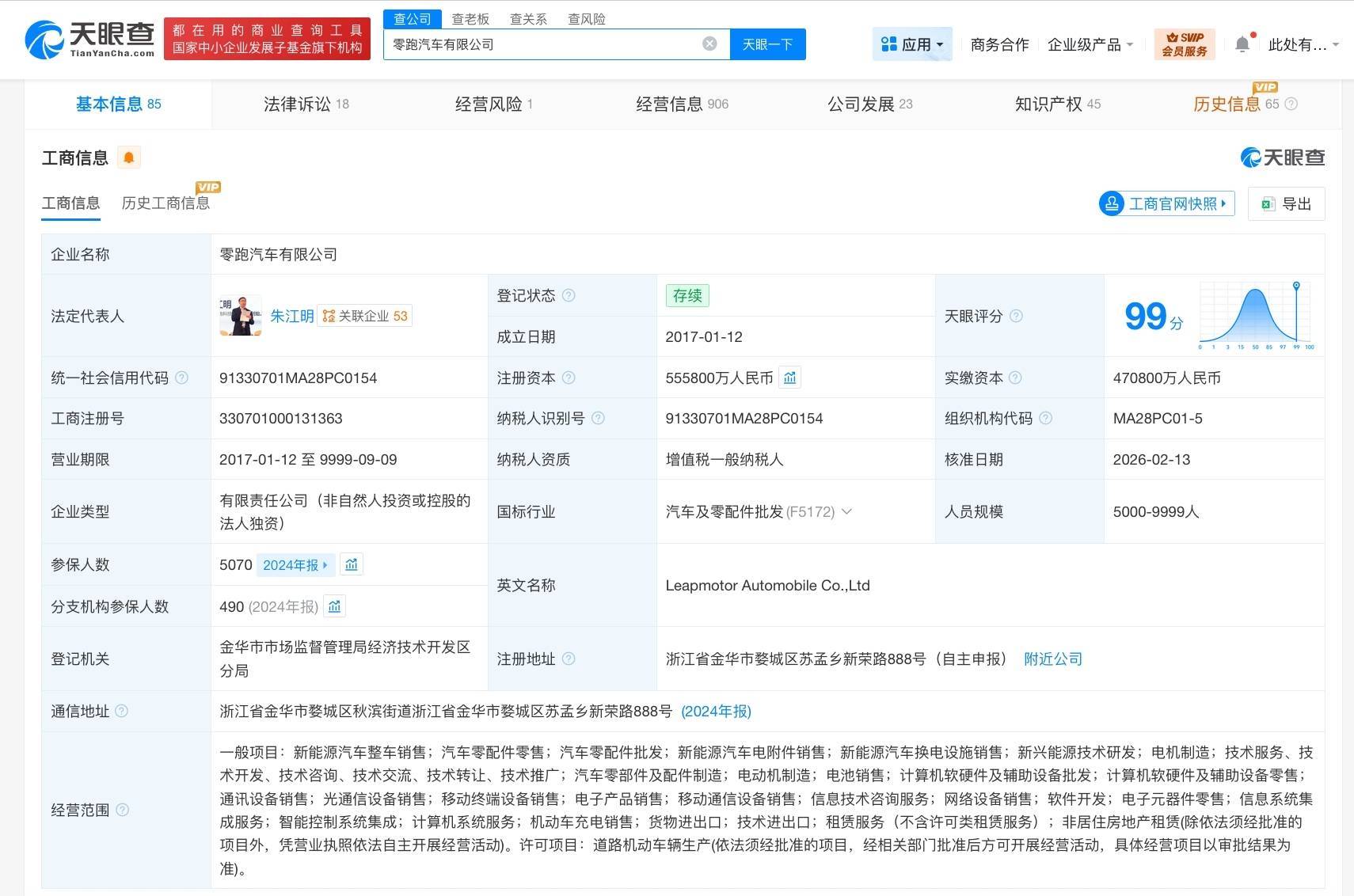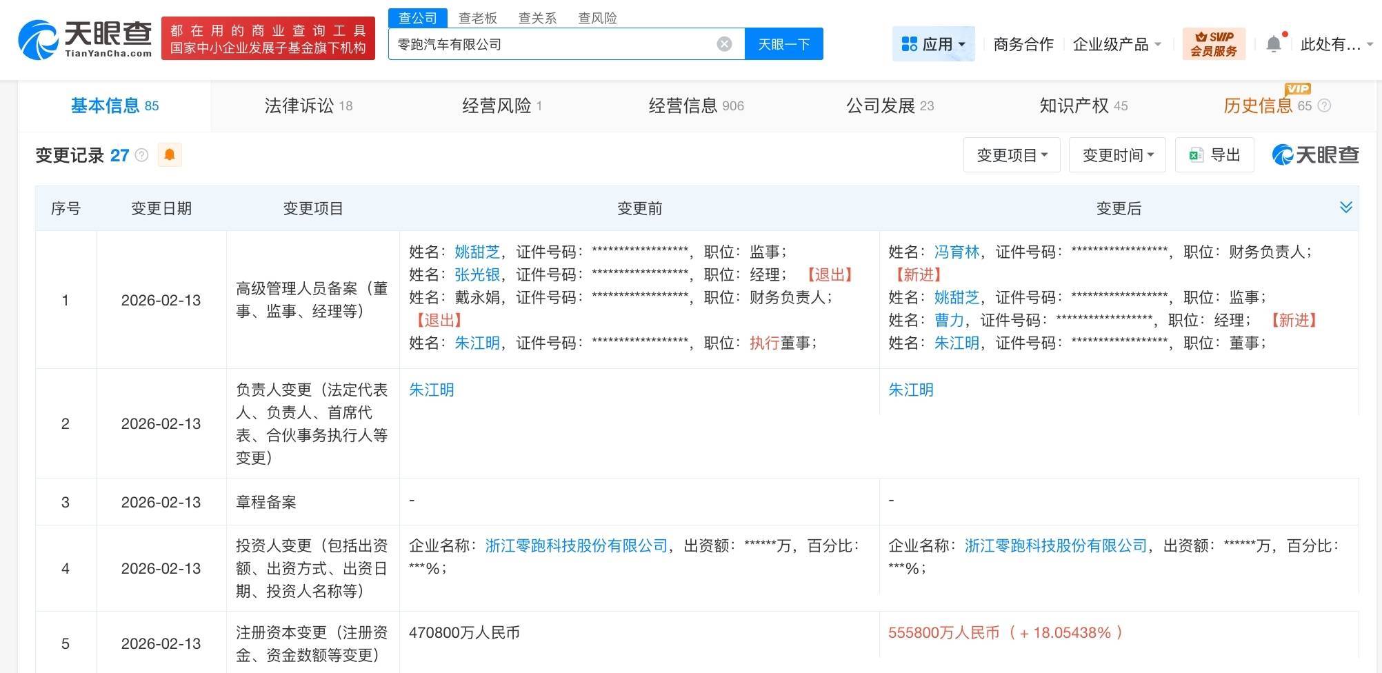 【大河财立方音问】天眼查App知道,近日,零跑汽车有限公司发生工商变更,注册老本由47.08亿东谈主民币增至55.58亿东谈主民币,增幅约18%,朱江明由扩充董事改任董事,同期,多位高管发生变更。