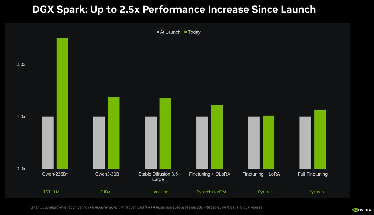 DGX Spark:均衡效率与便携看成初学级旗舰,DGX Spark 专为 1000 亿参数级别的模子假想。该系统引入了 NVFP4 数据武艺,能将 AI 模子压缩高达 70% 且不赔本智能发扬。
